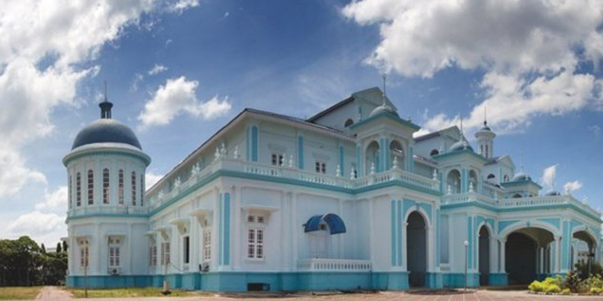 苏丹依布拉欣回教堂毗邻麻坡河,建于1887年,是麻坡历史最悠久的回教堂,融合了西方、中东及马来建筑风格,罗马柱门廊和阳台更具特色。