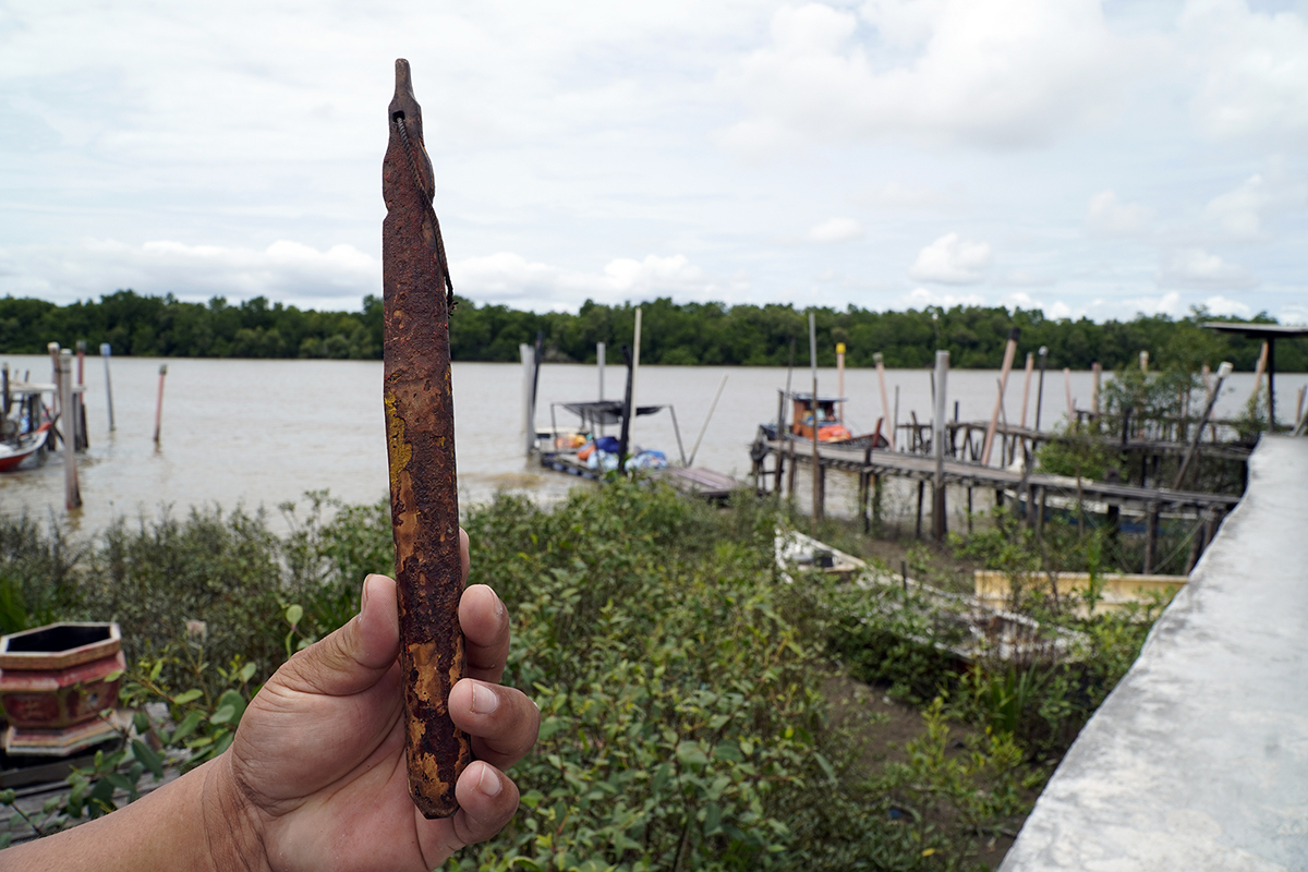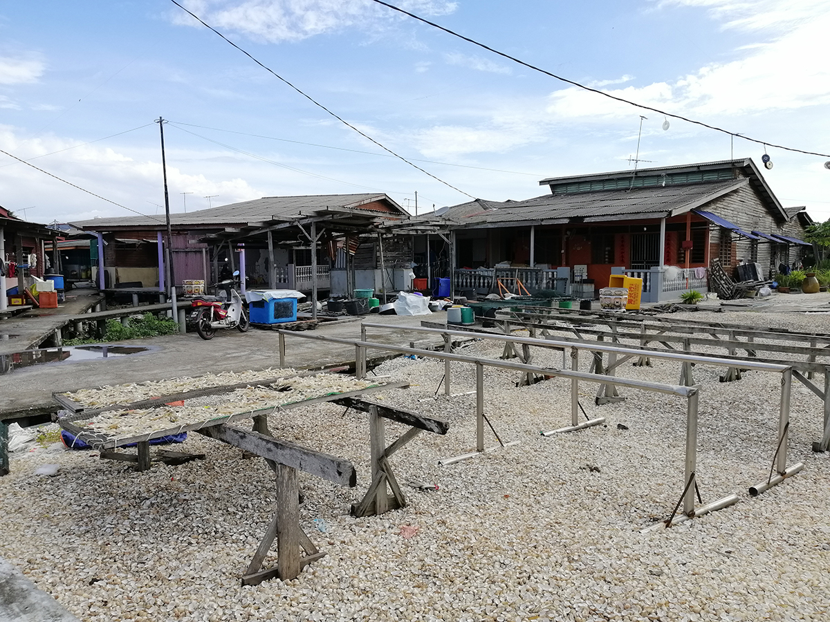 渔村里依河而建的房屋,屋外的道路就是石灰筑起的高脚路,唯有这条 Siham 路,是由血蚶壳铺成,数十年累积的蚶壳堆筑成4尺高的Siham 路。