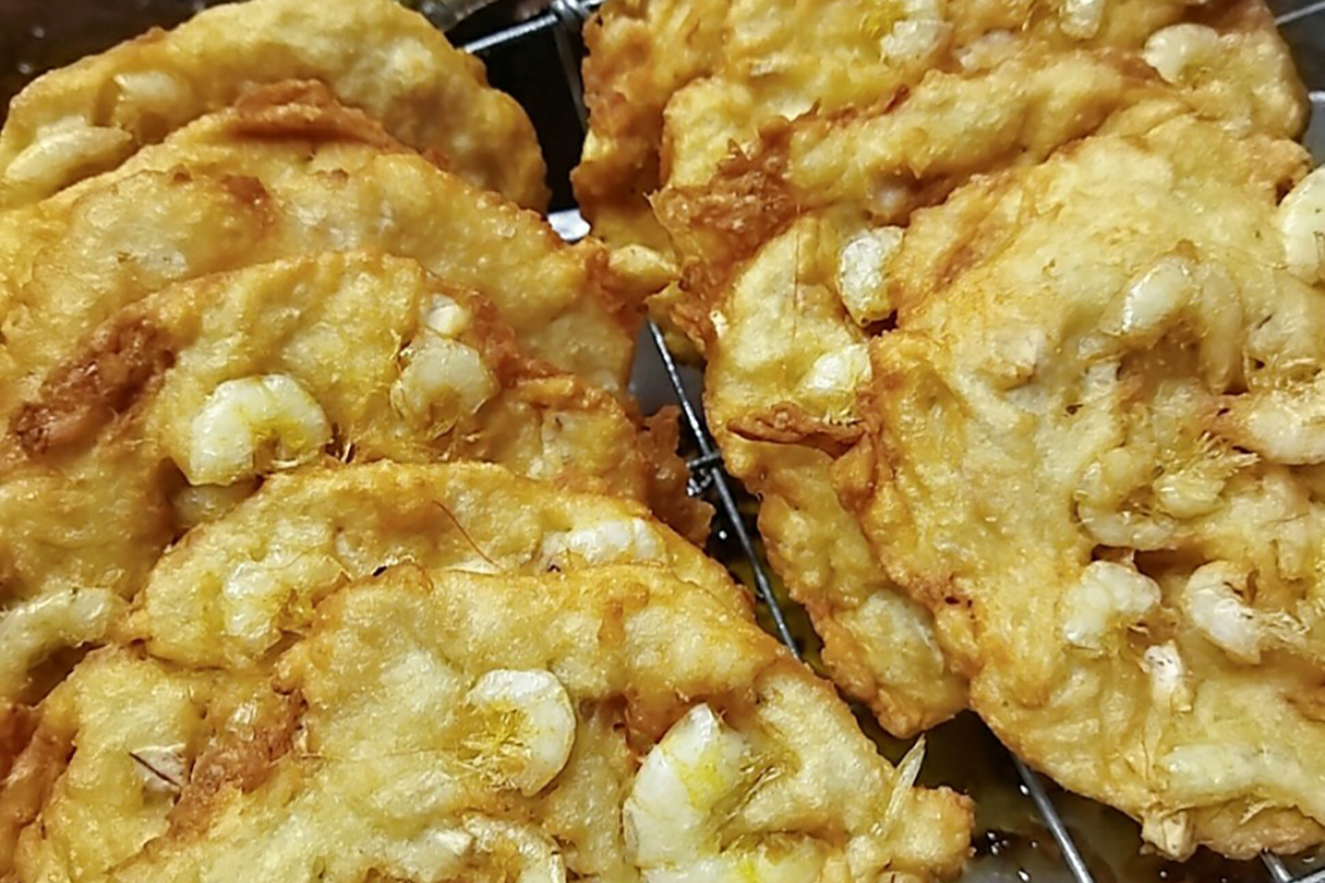 除了虾饼,“炸虾饼”也是不容错过的小吃。渔村有一档著名的“阿心虾炸”,古早味十足,肥美的虾仁与面粉炸到香脆金黄,满满的虾仁,脆口又美味。