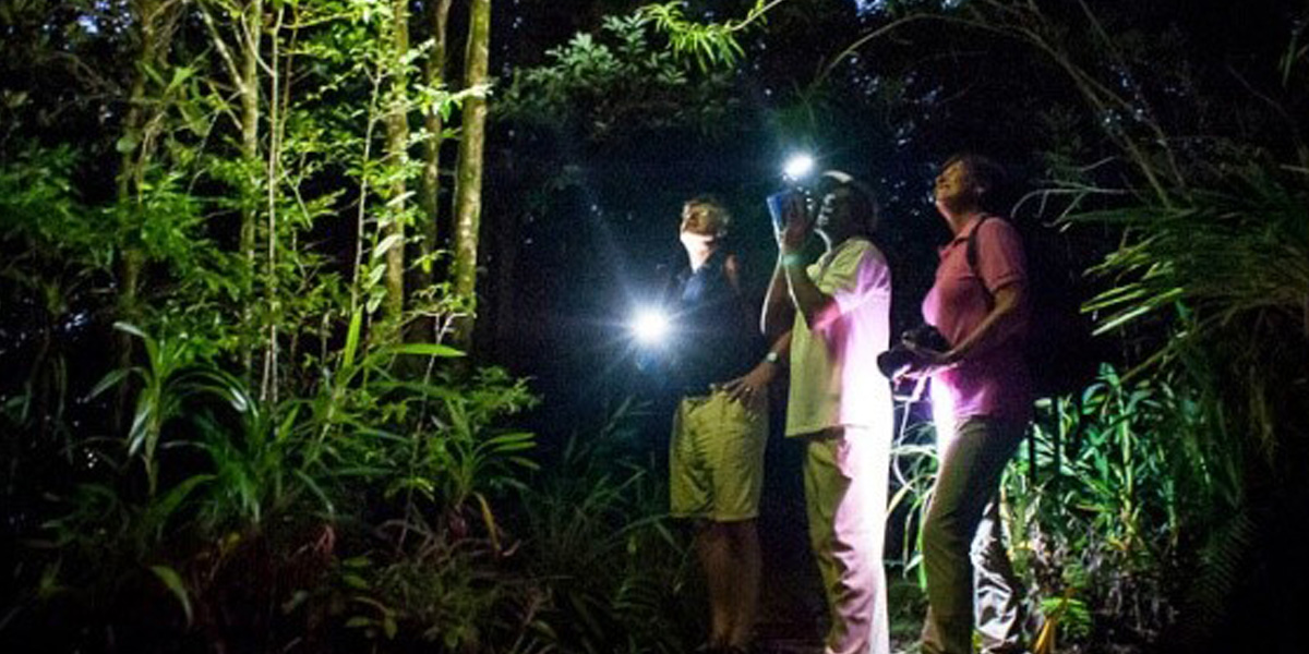 除了日间游览,夜游丛林的探险更别一番风味。进入丛林深处后,伸手不见五指,四周笼罩神秘气氛,记得必须要带手电筒。晚上进入丛林有机会近距离观察夜间活动的小动物、小昆虫、夜光蕈,数百种奇花异草等,导游看到有特别的小昆虫或植物时就会停下来为向大家解说。沿途中,虫鸣不绝于耳,夜空繁星光芒闪耀,还有萤火虫划过星空,真是非常漂亮。夜游丛林真的会是个令人刺激又难忘的经历。